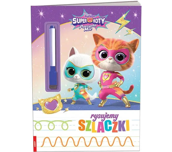 Bohaterowie z serialu Superkoty zapraszają do krainy szlaczków! W towarzystwie swoich ulubionych bohaterów z animacji najmłodsi będą ćwiczyć kreślenie szlaczków i rysowanie różnorodnych kształtów. Będzie to dla nich nie tylko wspaniała zabawa, ale też doskonały trening umiejętności manualnych przygotowujący do nauki pisania liter i cyfr. Dzięki specjalnym stronom i ścieralnemu mazakowi w każdej chwili dzieci mogą zacząć przygodę ze szlaczkami od nowa. Dodatkową atrakcją są wesołe rymowanki na temat ulubionych postaci.