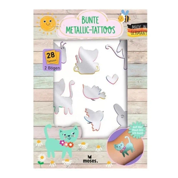 Metaliczne Kolorowe Tatuaże - 28 szt. Zestaw zawiera 28 starannie zaprojektowanych tatuaży na dwóch arkuszach, które po nałożeniu zachwycają kolorami i połyskującym metalicznym efektem. Przyjazne dzieciom motywy, takie jak zwierzęta, kwiaty i tęcze, są łatwe do nałożenia i zapewniają skórze olśniewający efekt. Idealne na urodziny dziecka, na wiosnę lub jako mała pamiątka! Tatuaże są przyjazne dla skóry, łatwe do nałożenia i usunięcia. 28 różnych motywów z połyskującym metalicznym efektem. Przyjazne dla skóry i łatwe w aplikacji. Idealne na urodziny dzieci lub jako mała pamiątka Wyprodukowano w Niemczech: wysoka jakość i bezpieczeństwo Testowany dermatologicznie przez Dermatest, wynik testu: bardzo dobry Posiada pieczęć gwarancyjną Dermatest. Produkty z tą pieczęcią zapewniają sprawdzoną i gwarantowaną jakość. Pieczęć aprobaty Dermatest to etykieta naukowa dla niezależnie testowanych produktów, które mają kontakt ze skórą. 100% wegańskie tzn. nie posiadają składników pochodzenia zwierzęcego, ani modyfikowanych genetycznie (GMO). Wymiary opakowania: 15,2 cm x 14 cm x 0,2 cm. UWAGA: Nie nadają się dla dzieci poniżej 3 roku życia. Ryzyko zadławienia. Lśniąca zabawa, która wywoła uśmiech na twarzy każdego! Produkty Moses są projektowane w Niemczech, ze szczególną dbałością o zrównoważony rozwój dziecka i wykonane z wysokiej jakości materiałów. Zabawki są wytwarzane zgodnie z filozofią "nauka przez zabawę", aktywnie wspierają i stymulują zarówno wyobraźnię jak i edukację dziecka.