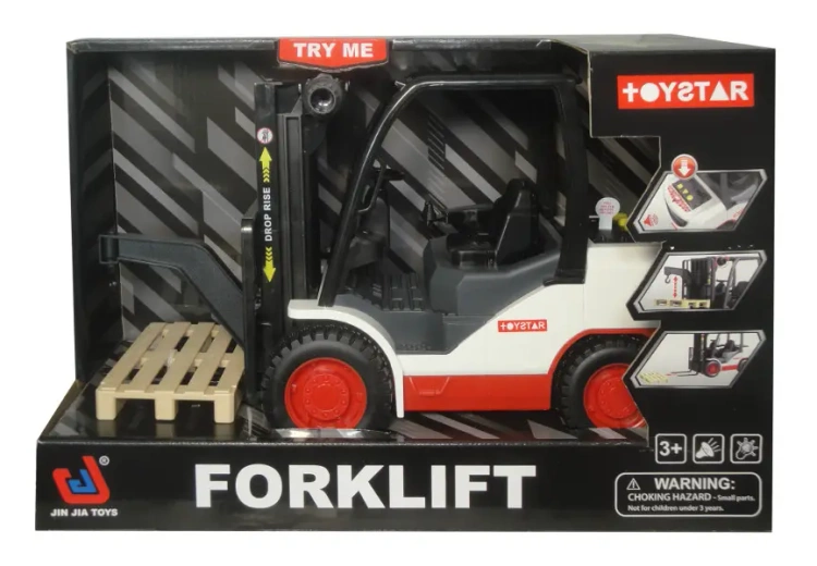 Zabawka wózek widłowy dla dzieci. Pojazd świeci kolorowym światełkiem i wydaje dźwięki cofania, klaksonu. Widły można podnosić i opuszczać za pomocą korbki. Zabawka działa na baterie typu AG13. Baterie są załączone do zabawki. Produkt dla dzieci od 3 lat. Podane wymiary są wymiarami opakowania. Zabawka zapakowana w kartonowe opakowanie. Podane wymiary są wymiarami opakowania.