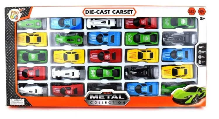 " Zestaw autek metalowych wyposażony jest w 25 pojazdów sportowych i wyścigowych, które są idealne do garaży i torów wyścigowych. Samochodziki mają długość 6,5 cm i są wykonane z metalu, dlatego są odporne na uszkodzenia. Autka nie posiadają napędu.