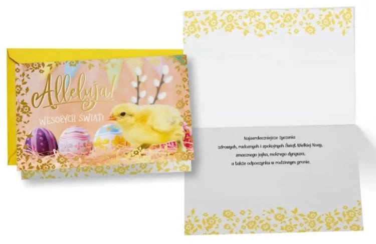 Karnet wielkanocny, posiada delikatne złote zdobienia. Kartka posiada tekst w środku, dołączona jest do niej koperta.