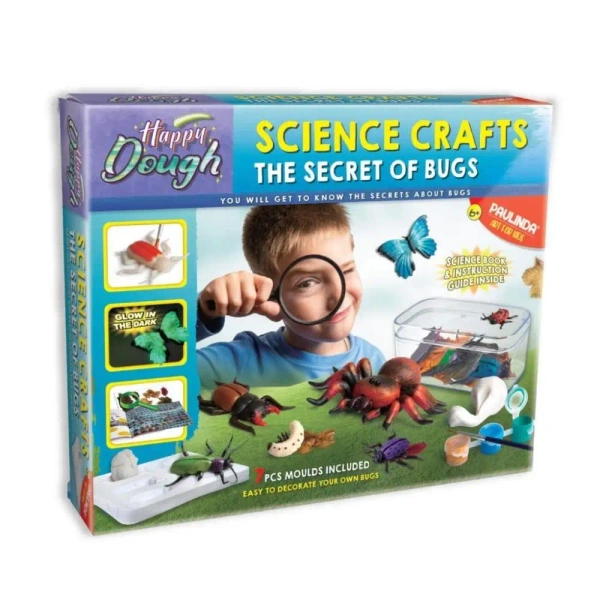 Zestaw zawiera: masę, formy, pędzelki, farbki, plastikowe terrarium, świecący proszek, szkło powiększające, plastikowe oczy, atlas insektów.