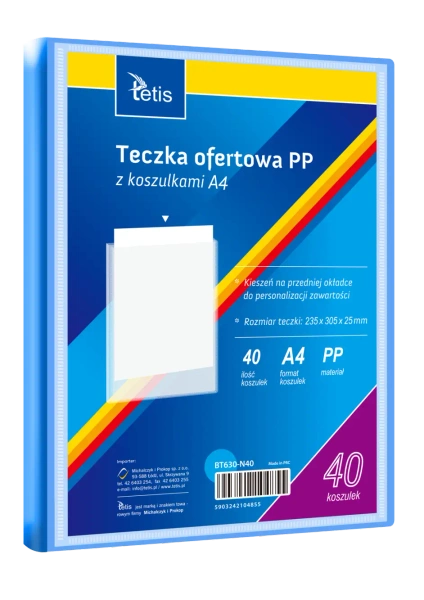 Odkryj nowoczesną teczkę ofertową wykonaną z trwałego polipropylenu, która pomoże Ci zapanować nad dokumentami. Posiada ona grzbiet i specjalną kieszeń opisową na frontowej okładce, co ułatwia identyfikację zawartości. Teczka ma uniwersalny format A4, co czyni ją idealną do przechowywania większości dokumentów.