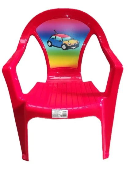 krzesełko plastikowe, kolor Czerwony, wtopiona etykieta IML z kolorowym motywem w oparcie krzesła uniemożliwa jego odklejenie i gwarantuje wysoką odporność na warunki atmosferyczne, doskonała dekoracja pokoiku dziecięcego (można również stosować na zewnątrz)
