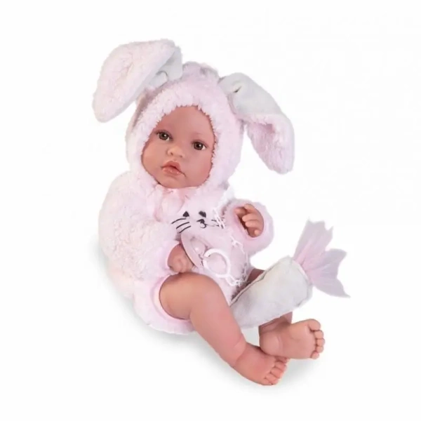 Lalka hiszpańska Erika króliczek Antonio Juan 50419 Zaprojektowana i stworzona z dbałością o każdy detal, lalka hiszpańska 50419 to wyjątkowy projekt Antonio Juan. Jedna z najbardziej rozpoznawalnych marek proponuje uroczą dziewczynkę o słodkiej twarzyczce, ubraną w śliczny pluszowy kostium króliczka. 42- centymetrowy bobas przypomina prawdziwe niemowlę. Ma zaznaczoną płeć. Jest wykonany z gładkiego, miękkiego, bezpiecznego dla dzieci winylu. Zachwyca wysokiej jakości szyty ręcznie strój, a zabawka w kształcie miękkiej marchewki uatrakcyjniają zabawę. Dlaczego warto wybrać dla dziewczynki lalkę hiszpańską o imieniu Erika? Lalka hiszpańska Antonio Juan 50419 wygląda jak żywe dziecko: brązowe, ręcznie malowane oczy opatrzone są długimi rzęsami i brwiami, uroku dodają lśniące usteczka oraz rumiane policzki, wyrzeźbione na główce włosy zapewniają najmłodszym bezpieczeństwo podczas zabawy, dopracowane paznokcie, linie papilarne oraz fałdki dodają bobasowi realizmu. Uzupełnij kolekcję lalek hiszpańskich o winylowego bobasa w kostiumie króliczka! Lalka hiszpańska 50419 marki Antonio Juan to marzenie każdego dziecka, uwielbiającego zabawę w odgrywanie ról. Autentyczny wygląd pozwala z łatwością wcielić się w rolę troskliwego rodzica. Erika ubrana jest w oryginalnie zaprojektowany, ciepły pluszowy kombinezon oraz czapeczkę z długimi króliczymi uszami. Strój z łatwością można zdjąć, a bobasa przebrać lub wykąpać. W zestawie także zabawka miękka marchewka z tiulowym wykończeniem oraz przypinany smoczek na łańcuszku. W całości wykonana w Hiszpanii luksusowa winylowa lalka dziewczynka zapakowana jest w firmowe, biało-różowe pudełko ozdobne z wieczkiem. Może ono posłużyć także jako łóżeczko dla bobasa.