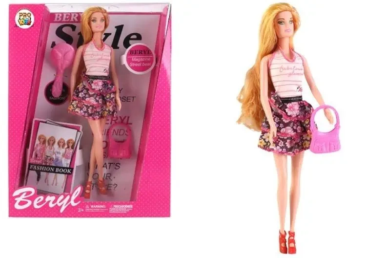 Lalka Beryl Style to idealna towarzyszka dla każdej miłośniczki mody! Ubrana w stylowy zestaw składający się z białej koszulki z modnym nadrukiem i połyskującej fioletowej spódniczki, zachwyca nowoczesnym wyglądem. Stylizację dopełniają czerwone sandałki na obcasie oraz niebieska torebka niezbędny dodatek każdej fashionistki. Długie, gęste blond włosy pozwalają na różnorodne stylizacje, a smukła sylwetka i delikatne rysy twarzy sprawiają, że Beryl wygląda niezwykle elegancko.