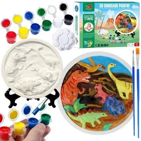 W zestawie znajduje się gipsowa podstawa z wzorem dinozaurów. Zabawka pozwoli nie tylko rozwinąć umiejętności artystyczne, ale także nauczyć się więcej na temat dinozaurów.