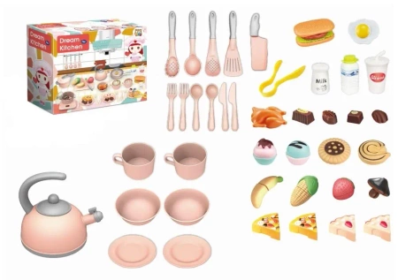 Zestaw zawiera różnorodne elementy, które umożliwiają zabawę w gotowanie i serwowanie posiłków. Filiżanki, sztućce, talerze i jedzenie zostały odwzorowane w realistyczny sposób, co zwiększa atrakcyjność zabawy. Dziecko może odgrywać różne role i tworzyć własne scenariusze, co rozwija jego kreatywność.