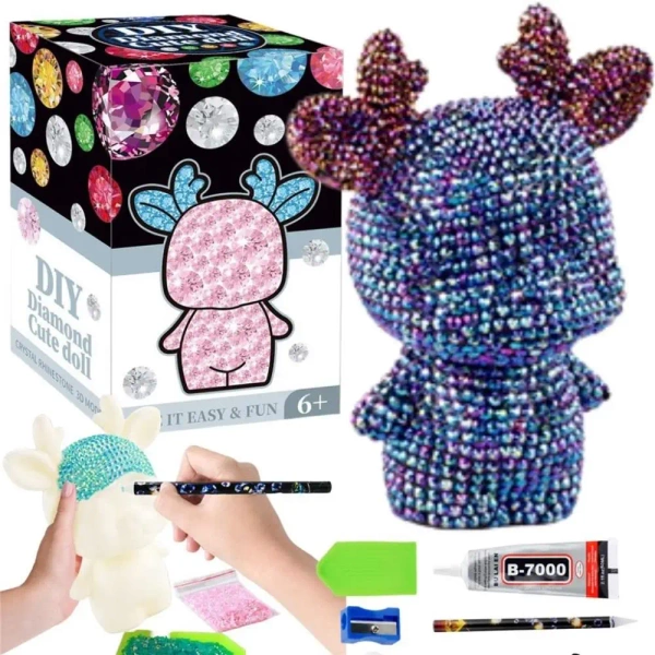W zestawie znajduje się figurka jelonka, która stanowi bazę do wyklejania kryształkami.
