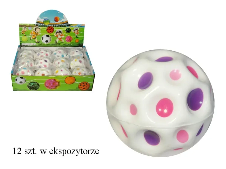 Piłeczka kosmiczna Spaceball w kolorze białym z kolorowymi wgłębieniami. Ma średnicę 7 cm, co sprawia, że jest idealna do zabawy zarówno w domu, jak i na zewnątrz. Po rzuceniu o ziemię, odbija się z wyjątkowo dużą prędkością, zapewniając dynamiczną, pełną energii zabawę, która nigdy się nie nudzi. Dzięki specjalnym wgłębieniom strukturze, piłka nie tylko świetnie odbija się, ale również nadaje się do ugniatania, co pozytywnie wpływa na rozwój umiejętności sensorycznych dziecka. Piłka zapakowana