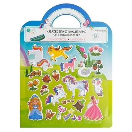 Książeczka z naklejkami to produkt skierowany do dzieci, który pozwala rozwijać kreatywność poprzez budowanie własnych opowieści przy pomocy naklejek. W zestawie znajduje się książeczka z pięknym krajobrazem i gładkim wykończeniem a także 23 naklejki typu puffy z wizerunkami jednorożców, księżniczek, kwiatków i innych zwierzątek, które można wielokrotnie przyklejać i odklejać. Naklejki mają wypukłą teksturę, co sprawia, że są atrakcyjne w dotyku. Produkt rozwija wyobraźnię dziecka, pozwala na tworzenie różnych scenek oraz ćwiczenie zdolności manualnych i koncentracji.
