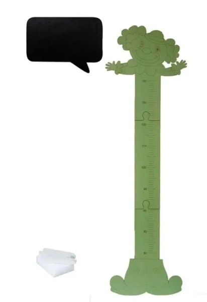 Drewniana Miarka wzrostu Klaun kolorowy z tablicą do pisania (do przyklejenia na ścianie). Zestaw zawiera kredę oraz gąbkę