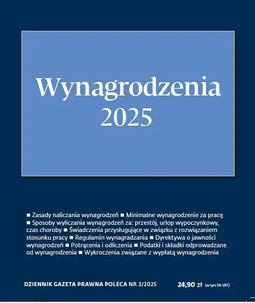 W poradniku "Wynagrodzenia 2025" przedstawione zostały ogólne zasady dotyczące wynagrodzeń, sposób ustalania wynagrodzenia za pracę i innych świadczeń z nią związanych oraz zasady jego wypłaty. Osobnym zagadnieniem, które przybliżamy, jest tzw. dyrektywa o jawności wynagrodzeń oraz regulacje ESG, a także kwestie ochrony wynagrodzenia, należności publicznoprawnych oraz sankcji grożących za naruszenie przepisów ochronnych dotyczących wynagrodzeń. "Wynagrodzenia 2025" - co omawia poradnik? Minimalne wynagrodzenie za pracę Sposoby wyliczania wynagrodzenia, za przestój, za urlop wypoczynkowy, za czas choroby Ekwiwalent za niewykorzystany urlop wypoczynkowy Odprawy dla pracownika Regulamin wynagradzania Dyrektywę o jawności wynagrodzeń Dochodzenie roszczeń Potrącenia i odliczenia ZUS i podatki od wynagrodzeń Wykroczenia związane z wypłatą wynagrodzenia