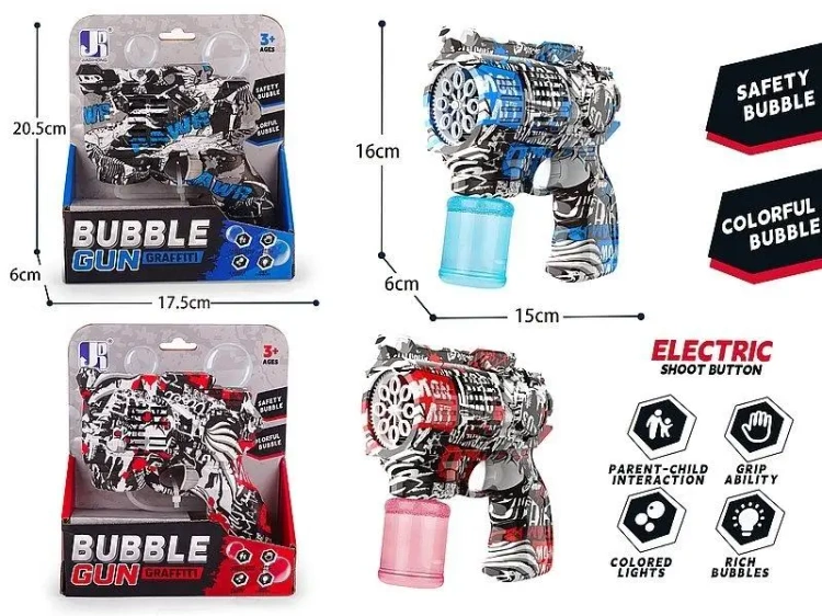pistolet z bańkami mydlanymi, na baterie, 4xAA niedołącz., światło, 16x15x6cm; 20,5x17,5x6cm, W/B