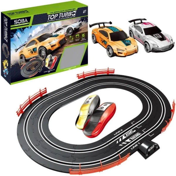 TOP TURBO - Mini Tor Wyścigowy Slot Racing 1:43 Poczuj dreszczyk emocji wyścigów samochodowych w swoim własnym domu! Zestaw TOP TURBO to idealna propozycja dla młodych fanów motoryzacji i nie tylko. Ten kompaktowy tor wyścigowy w skali 1:43 dostarczy mnóstwo radości i emocji zarówno dzieciom, jak i dorosłym. Zalety produktu: Łatwy montaż: Tor jest prosty w montażu, co pozwala na szybkie rozpoczęcie zabawy. Kompaktowy rozmiar: Idealny do zabawy w domu, nawet w niewielkich pomieszczeniach. Dwa samochody w zestawie: Dwa stylowe samochody wyścigowe w różnych kolorach zapewniają emocjonujące pojedynki. Kontrolery ręczne: Precyzyjne kontrolery pozwalają na płynne sterowanie samochodami. Realistyczne detale: Samochody i tor zostały wykonane z dbałością o szczegóły, co zwiększa realizm zabawy. Rozwija koordynację: Zabawa torem wyścigowym pomaga rozwijać koordynację wzrokowo-ruchową i refleks. Świetna zabawa dla całej rodziny: Idealny sposób na spędzenie czasu z rodziną i przyjaciółmi. Specyfikacja: Skala: 1:43 Zasilanie: (informacja o bateriach lub zasilaczu, jeśli dotyczy) Wiek: 8+ Zawartość zestawu: tor wyścigowy, 2 samochody, 2 kontrolery ręczne, instrukcja Zestaw TOP TURBO to doskonały pomysł na prezent dla każdego miłośnika szybkich samochodów!