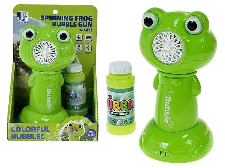 żabka z bańkami mydlanymi, na baterie, 4xAA niedołącz., światło, 21x15x11cm; 24,5x16x11,5cm, W/B