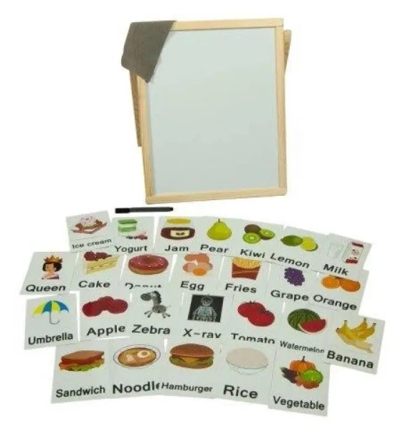 Drewniana magnetyczna rozkładana tablica, z kompletem 27 magnesów - obrazki produktów rozpoczynających się na kolejne litery alfabetu i ich nazwy (w języku angielskim). Zestaw zawiera marker