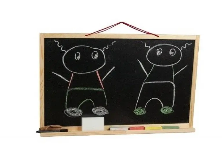 Wisząca drewniana, magnetyczno-kredowa tablica z podstawą na kredę. Podstawa przekładana na każdą ze stron. Wyposażona w gąbkę oraz kredę. Zestaw zawiera marker suchościeralny