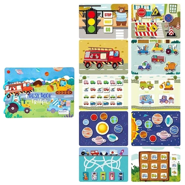Książeczka aktywizująca do samodzielnego złożenia Znaki drogowe, pojazdy, planety, elementy na rzepy. Nauka w stylu Montessori Wymiary: 30.5 x 3.5 x 21.7 cm