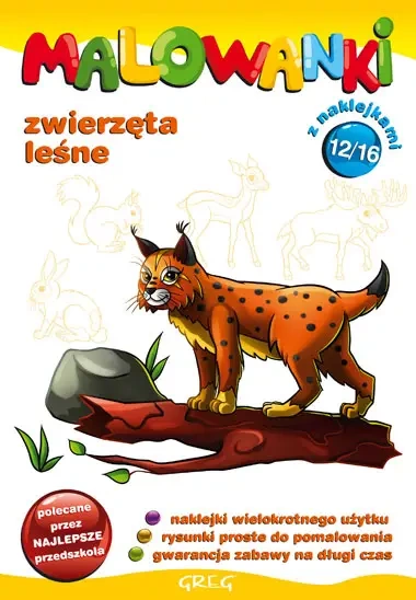 Malowanka Zwierzęta leśne to ilustracje przedstawiające zwierzęta żyjące dziko w lesie. Dziecko ma możliwość pokolorować wilki, lisy, niedźwiedzie, łosia i wiele innych. Kolorowe naklejki wielokrotnego użytku prezentują bardzo zbliżoną do naturalnej kolorystykę zwierząt i mogą służyć jako podpowiedź dla malucha. Rysunki przygotowane przez ilustratora są bardzo ciekawe, a jednocześnie proste do pomalowania. Można też łatwo wyrwać stronę dzięki perforowanym kartkom.