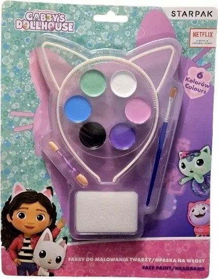 Farby do malowania twarzy, ciała, 6 kolorów z akcesoriami w postaci opaski z uszami Gabby Dollhouse STARPAK. Farby w 6 kolorach: niebieskim, fioletowy, czarnym, różowym, zielonym oraz białym, farby łatwo zmywalne, bezpieczne (przed użyciem zapoznaj się z opisem produktu znajdującym się na opakowaniu!).Dzięki temu zestawowi kreatywność dziecka nie zna granic! Każda farbka zapakowana w osobnym pojemniczku, mały podwójny aplikator do malowania oraz mały pędzelek i gąbeczka z pewnością spełnią oczekiwania. Zawartość zestawu: 6 kolorów farb do malowania twarzy, 1 x pędzelek, 1 x aplikator do malowania, gąbka, opaska z uszami