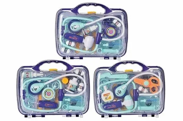 W zestawie: stetoskop, urządzenie do badania uszu, stoper, strzykawka, okulary, 4 narzędzia lekarskie, 5 tabletek, pojemnik na krople, kartonik na leki, tacka, funkcje: stetoskop - po naciśnięciu przycisku słychać dźwięk bicia serca, podświetla się dioda do rytmu, urządzenie do badania - po naciśnięciu przycisku włącza się światełko, wym. Opak. 28,5 x 23,5 x 7 cm, baterie 3 x ag13 (stetoskop), 3 x ag13 (urządzenie do badania) dołączone testowe, 3+
