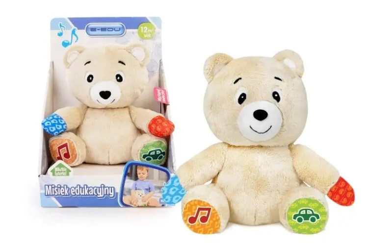 Funkcje: 2 sensory w nóżkach - po naciśnięciu na prawą nóżkę: odtwarza 6 piosenek, po naciśnięciu na lewą: mówi wierszyki i krótkie frazy o onomatopejach, wydaje dźwięki, szeleściki w uszach, wys. misia 20 cm, baterie 3 x ag13 dołączone demonstracyjne, 20 x 29 x 15 cm, 12m+