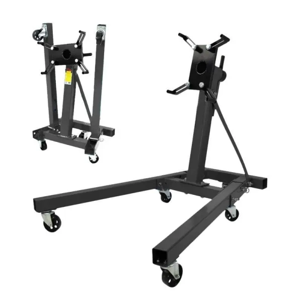 Wykonany z wytrzymałej stali, malowany proszkowo na czarno. Głowica obrotowa o 360 stopni z czterema regulowanymi ramionami umożliwia bezpieczne umieszczenie silnika. Wyposażony w 6 obrotowych kółek ułatwiających manewrowanie. Idealny do łatwego montażu i demontażu silników. Składane nogi dla wygodnego przechowywania. Spełnia standardy jakościowe CE. Dane techniczne: Udźwig: 900 kg Wysokość: 880 mm Waga: 39.00 kg