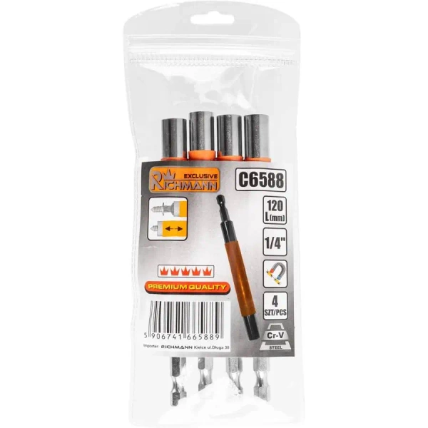 Zestaw 4 sztuk uchwytów magnetycznych z ogranicznikiem o długości 120 mm do bitów. Zastosowany mechanizm pozwala na szybką regulację głębokości umieszczenia bitu. Niezwykle przydatne przy pracy z płytami gipsowo kartonowymi, zapobiega zniszczeniu materiału podczas wkręcania. Niestandardowa długość umożliwia wkręcanie w trudnodostępnych miejscach. Wykonane ze stali chromowo-wandowej (Cr-V) w której zastosowany chrom gwarantuje podwyższoną odporność stali na korozję, utlenianie i ścieranie, a dodatek wanadu podnosi ogólne właściwości stali w tym odporność na działanie wysokich temperatur czy nieuleganie deformacjom. Zastosowane wysokiej jakości materiały gwarantują długą żywotność. Opakowanie zbiorcze wielokrotnego użytku z oczkiem. Przeznaczony do pracy z wkrętarkami. Standardowe mocowanie 1” HEX. Jakość premium.