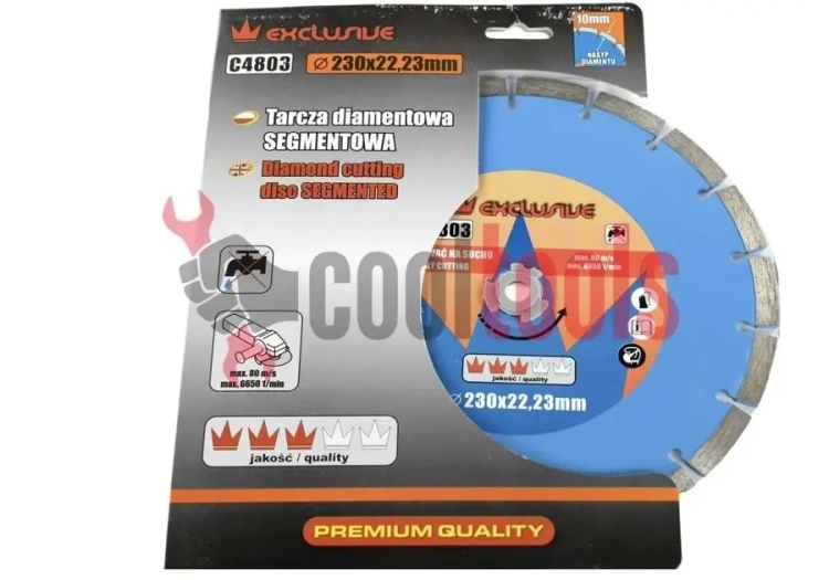 Informacje dotyczące tarczy diamentowej segmentowej Corona / Richmann C4803: Tarcze diamentową segmentową C4803 można stosować na sucho. Wymiary tarczy diamentowej: 230 x 22, 23 mm. Tarcza diamentowa segmentowa C4803 posiada skale jakości określoną zgodnie z testami firmy Corona 3 z 5. Parametry robocze tarczy C4803: max. prędkość obrotowa: 6650 obr/min max. prędkość chwilowa na krawędzi zew. tarczy: 80 m/s Przeznaczenie tarczy diamentowej segmentowe C4803: beton utwardzony cegła granit mur kamień