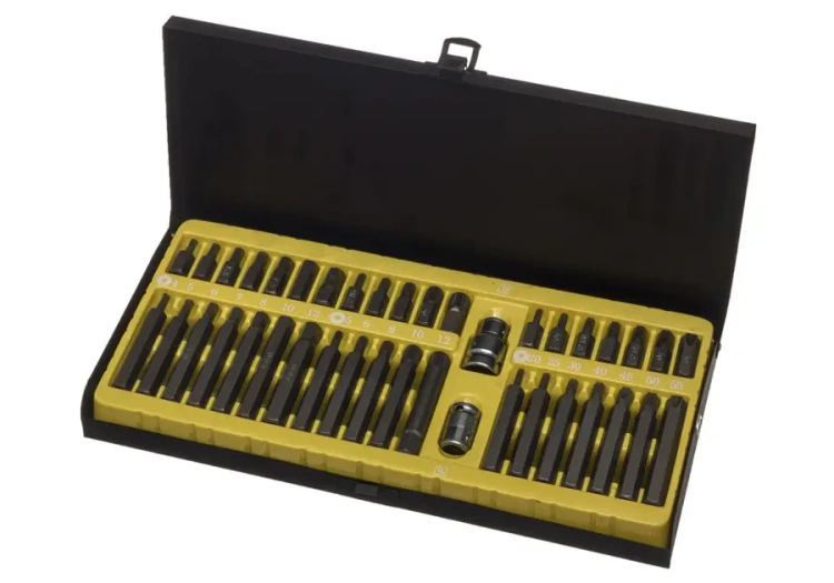 W prezentowanym zestawie kluczy wpustowych znajdują się następujące rozmiary: TORX: T20, T25, T30, T40, T45, T50, T55 IMBUS (HEX): 4, 5, 6, 7, 8, 10, 12 mm SPLINE: 5, 6, 8, 10, 12 mm uchwyty : 1/2 oraz 3/8