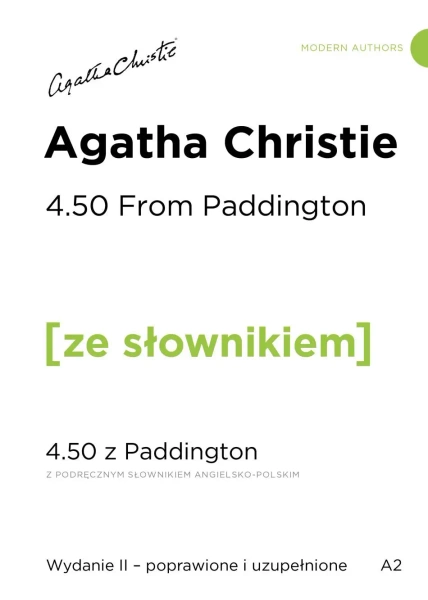 Co robić, gdy jest się świadkiem morderstwa, ale nawet policja nie potrafi znaleźć ciała ofiary? Zlecić rozwiązanie tej zagadki niezawodnej pannie Marple. Powieść kryminalna 4.50 z Paddington, wydana w 1957 roku, należy do prawdziwej klasyki tego gatunku. Agata Christie tym razem w roli detektywa amatora obsadziła niepozorną staruszkę, która postanawia wszcząć własne śledztwo i dowiedzieć się, kto stoi nie tylko za tajemniczą zbrodnią w pociągu, ale też za kolejnymi, do których dochodzi w domu państwa Crackenthorpe'ów. Panna Marple, dzięki przyjaciółce, Lucy Evesbarrow, zdobywa informacje, wyciąga kolejne wnioski i ponownie udowadnia, że jej zdolność dedukcji w niczym nie ustępuje tej, którą szczyci się inny bohater książek Agaty Christie - Herkules Poirot. Fani twórczości angielskiej autorki zdecydowanie powinni sięgnąć po ten tytuł. Historia to naprawdęnietypowa.