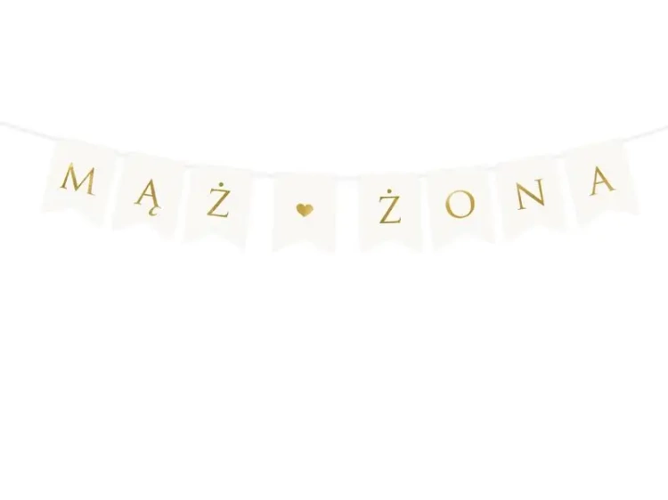 Baner w kolorze białym ze złotym napisem Mąż Żona, do samodzielnego złożenia, zestaw zawiera literki i ok. 2,5 m białej tasiemki, wymiary po złożeniu: wysokość ok. 15 cm, długość ok. 110 cm.