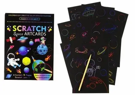 Zestaw kreatywny "Zdrapywanka Kolorowanka" przeznaczony dla dzieci jest doskonałą kompozycją edukacji i rozrywki. Pakiet zawiera 9 wspaniałych obrazków do zdrapywania, które zmieniają się w barwne ilustracje, kiedy maluchy używają dołączonego drewnianego patyczka. Każda z nich prezentuje intrygujące sceny z kosmosu, które odsłaniają się jak magia! Zabawa polega na zdrapiwaniu czarnej powierzchni, ujawniając kolorowe obrazy ukryte pod nią.
