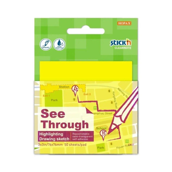 Przezroczysty, żółty notes samoprzylepny 76 x 76 mm do odrysowywania Notes zawierający 50 foliowych karteczek o wielkości 76 x 76 mm.Przezroczyste karteczki są idealne do robienia zapisków w książkach, zaznaczania i podkreślania w nich treści oraz odrysowywania małych rysunków.