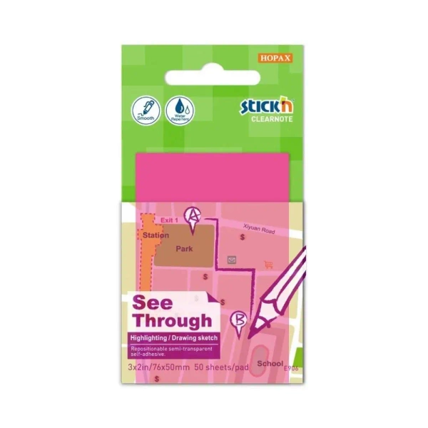 Przezroczysty, różowy notes samoprzylepny 76 x 51 mm do odrysowywania Notes zawierający 50 foliowych karteczek o wielkości 51 x 76 mm.Przezroczyste karteczki są idealne do robienia zapisków w książkach, zaznaczania i podkreślania w nich treści oraz odrysowywania małych rysunków.