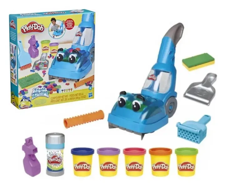 Zabawka do czyszczenia zawiera również 5 tub ciastoliny Play-Doh i 6 akcesoriów, w tym łopatę do kurzu, formę gąbkową, szczotkę, wałek ręczników i narzędzie do tworzenia zabawnych kształtów, które odkurzacz może zebrać.