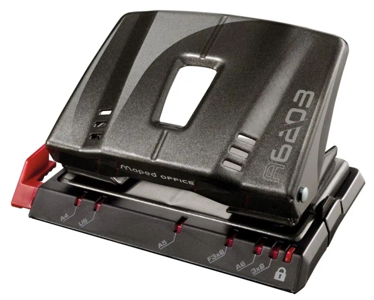 Wgłębienia w tylnej części podstawy zgodne z rozstawem ringów w segregatorze umożliwiają szybkie dziurkowanie bez użycia listwy formatowej. Wskaźnik środka strony. Łatwy do otwierania pojemnik na ścinki. Odległość między dziurkami 8 mm.
