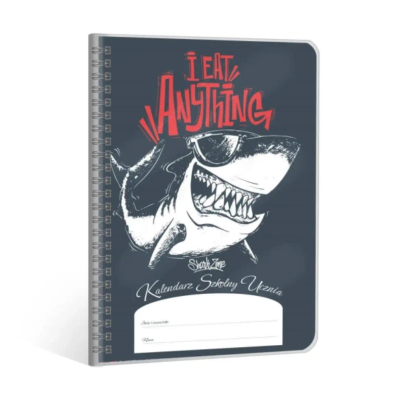 "Kalendarz książkowy. Układ kalendarium tygodniowy. Format A5;120 str, oprawa miękka. Format 145 mm x 210 mm. Łączony na spirali po długim boku, zadruk full kolor, kalendarium od września 2025 do sierpnia 2026, Rozkład kalendarium tygodniowy, tabele ocen, szkolne tabele miar, itp.Tabele ułatwiające zapisywanie terminów sprawdzianów, tabele do wpisywania ocen oraz tytułów lektur, obrazkowa instrukcja udzielania pierwszej pomocy, tabele ułatwiające naukę np.: jednostki miar, wzory matematyczne itp."
