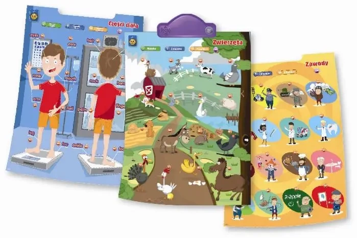 Plakaty interaktywne to trzy plakaty do wyboru: Zwierzęta, części ciała i zawody. Uczą nazw zwierząt, zawodów i części ciała. Uczą także budowania zdań, jak również angielskich nazw części ciała.
