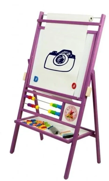 Obrotowa, jasnofioletowa, suchościeralno-kredowo-magnetyczna tablica z 2-rzędowym liczydłem i rolką papieru do rysowania, 3 rodzaje zegara z ruchomymi wskazówkami. Wyposażona w gąbkę i kredę. Marker w zestawie.