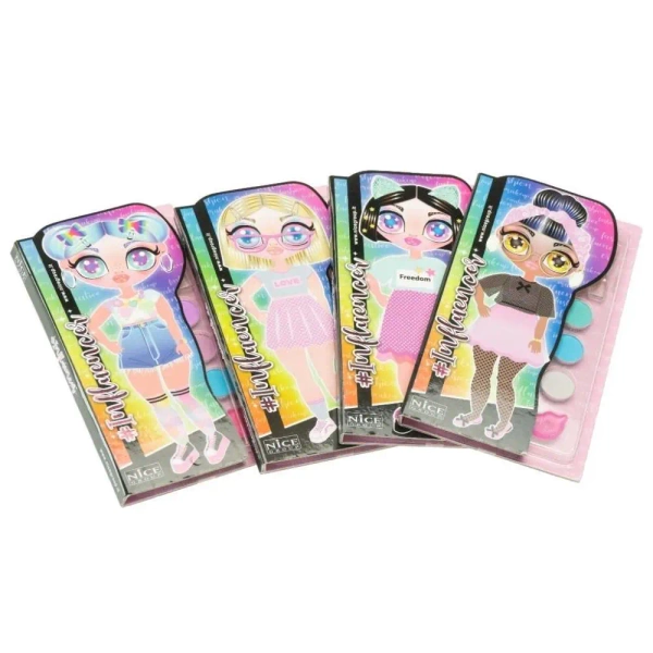 Kolorowa kasetka zawierająca paletę do makijażu z aplikatorami i lusterkiem w kształcie serca. Dostępna w 4 wersjach: wybierz swoją ulubioną - wysyłka losowo