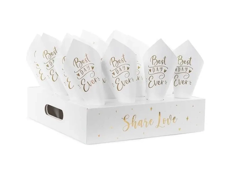 Stojak na rożki do konfetti, mix kolorów. Zestaw zawiera 16 papierowych rożków na konfetti ze złotym napisem oraz stand do samodzielnego złożenia.