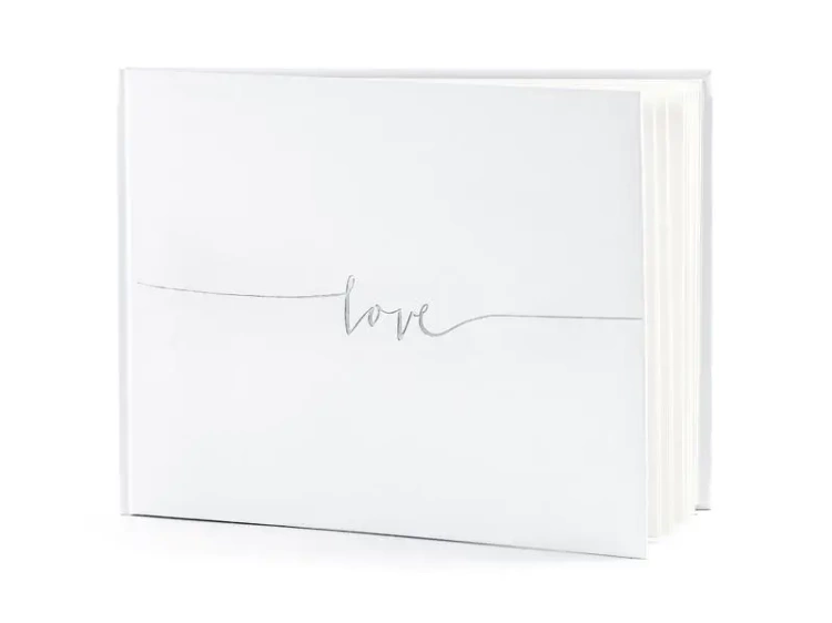 Księga Gości oprawiona papierem w kolorze białym, ze srebrnym napisem Love, wymiary ok. 24 x 18,5 cm, 22 kartki, bez tekstu.