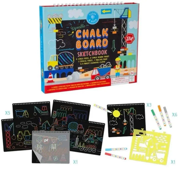 Zabawa szkicownikiem z kredowymi pisakami, idealna dla małych artystów! To genialny szkicownik z kartami, które można pokolorować pisakami na bazie kredy. Szkicownik zawiera 5 kart z gotowymi ilustracjami do pokolorowania i 3 puste karty, na których można tworzyć własne wzory i obrazki. Znajduje się tam również arkusz kalki kreślarskiej oraz arkusz szablonów z koparką, dźwigiem, betoniarką i innymi. Oba te arkusze można przypiąć do spirali szkicownika. W zestawie znajduje się 6 kolorowych pisaków kredowych oraz ściereczka do czyszczenia, dzięki której można zetrzeć karty i rozpocząć kreatywną zabawę od początku.