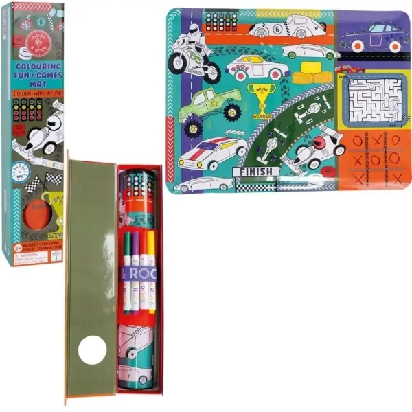 Silikonowa mata do kolorowania, gier i zabaw to świetna, wielofunkcyjna rozrywka, idealna zarówno do domu, jak i na czas podróży. Wystarczy rozłożyć matę, by zanurzyć się w kolorowaniu, łączeniu kropek, pokonywaniu labiryntu czy grze w kółko i krzyżyk. Mata przedstawia tor wyścigowy z szybkimi samochodami, motocyklem i imponującą ciężarówką. Zestaw zawiera 4 kolorowe pisaki suchościeralne oraz poręczną ściereczkę do czyszczenia. Po skończonej zabawie matę można łatwo wytrzeć, zwinąć, spiąć silikonową opaską i schować do praktycznego pudełka. Co najlepsze, matę można używać wielokrotnie!