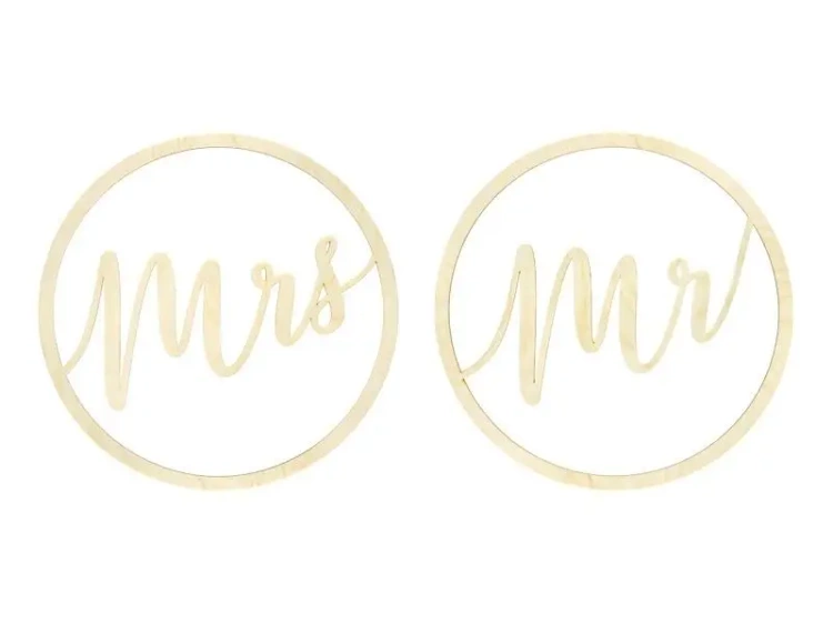 Zawieszki dekoracyjne wykonane z drewna, zestaw zawiera zawieszkę z napisem Mr oraz zawieszkę z napisem Mrs, średnica ok. 38 cm.(1 op. / 2 szt.)