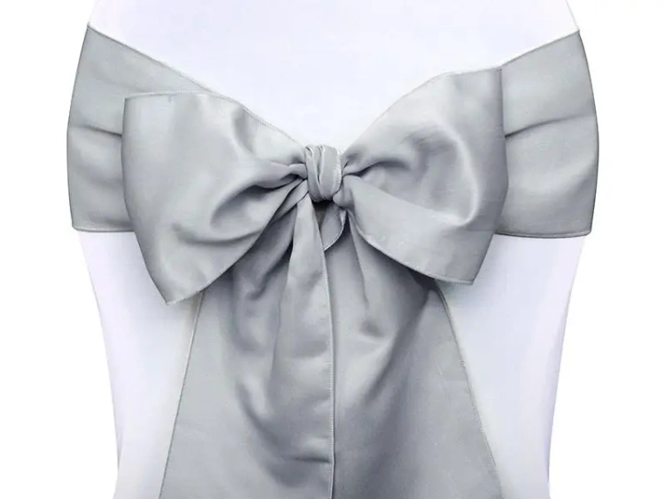 Szarfy na krzesło z grubej matowej satyny w kolorze srebrnym, długość 2,75 metra, szerokość 15 centymetrów.(1 op. / 10 szt.)