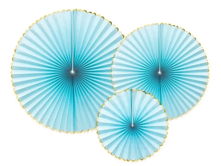 Rozety dekoracyjne Yummy w kolorze jasnoniebieskim ze złotymi brzegami, średnice ok.: 40 cm, 32 cm i 23 cm.(1 op. / 3 szt.)