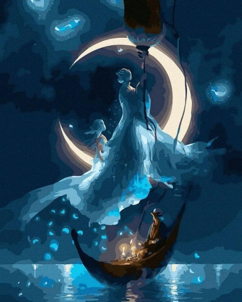 Zaczarowana scena postaci w sukienkach unoszą się balonem ku księżycowi, odbijając się w wodzie. Idealna dla marzycieli i romantyków.